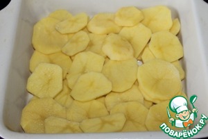 Глубокую форму смазываем растительным маслом и выкладываем равномерно часть порезанного картофеля.