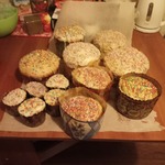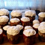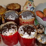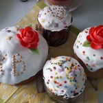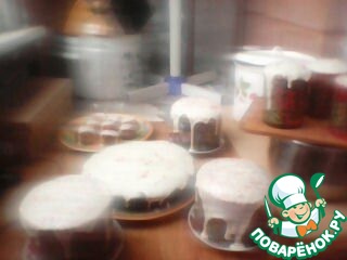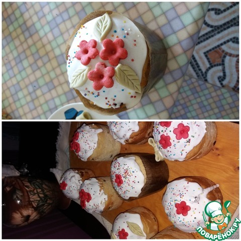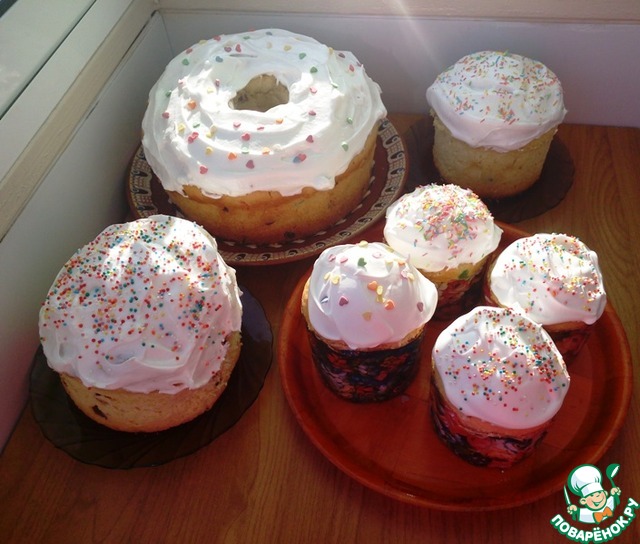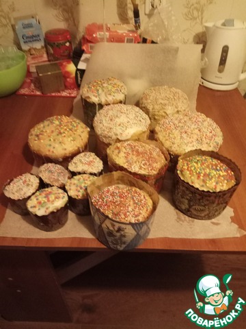 4 кулича у меня получились из 1/4 нормы всех продуктов, т. е. 250 мл молока, 250 мл сахара, 125 г масла, 2,5 яйца, 1 желток, 37 г дрожжей. Ну, и все остальное тоже делила на 4.