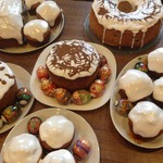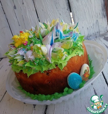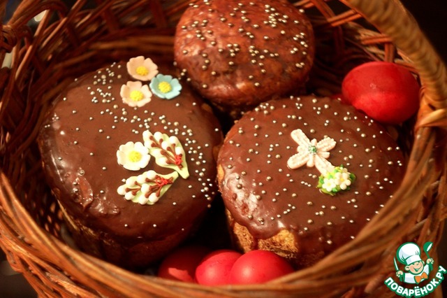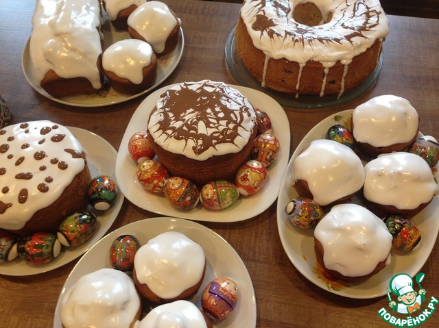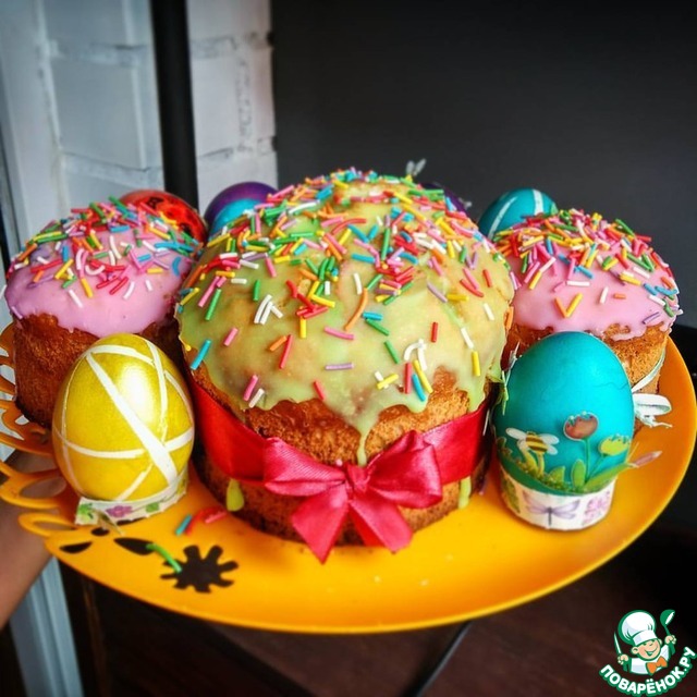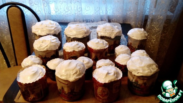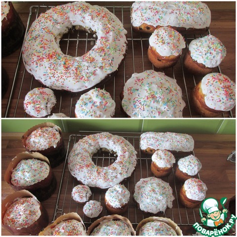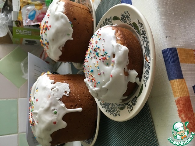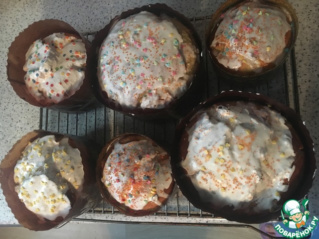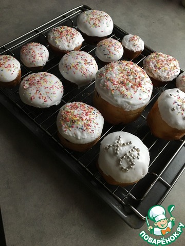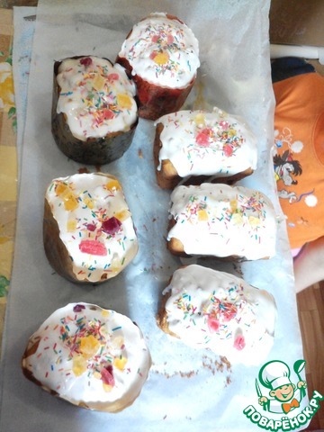 Верх остывших куличей смазать глазурью, украсить по желанию.