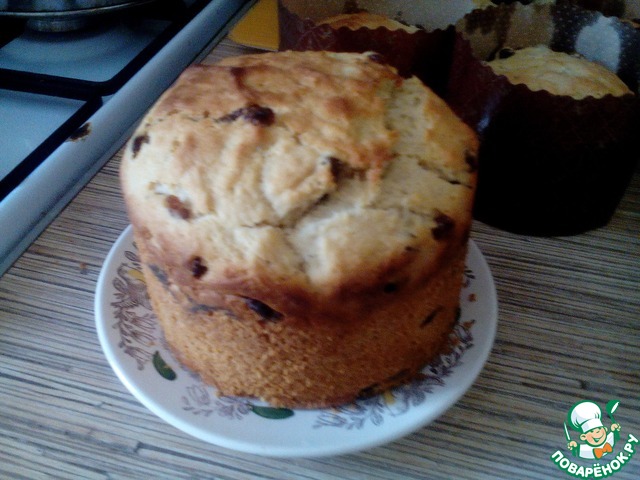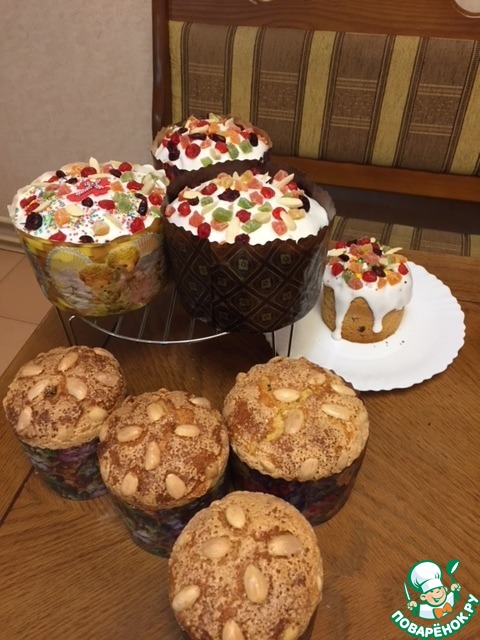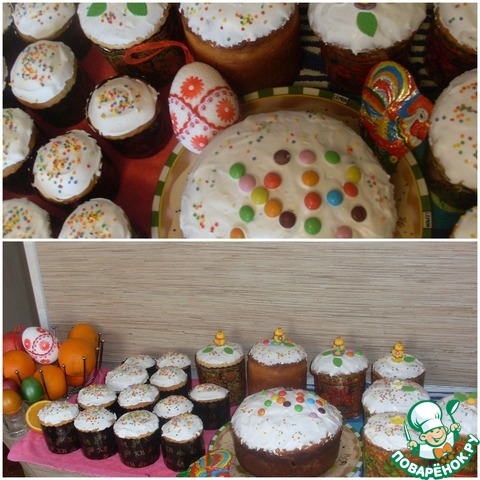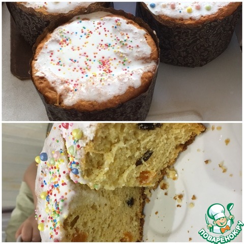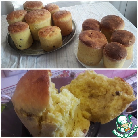 Рецепт нашла в интернете. Это самый простой рецепт из всех, что я знаю, в сочетании с отличным вкусом. Куличи нежные, мягкие, воздушные и, главное, не сухие. Автор писала так: "Сладкие, нежные, мягкие... Вкуснее я не ела в жизни. Рецепт бабушкин, готовит она по этому рецепту уже несколько десятков лет." Не могу согласиться с ней на 100%. Чай с куличами пили всей семьей, на семейном совете решили, что Коломба гораздо вкуснее. Из заявленной нормы продуктов получается очень много куличей. Можно смело делить на 2, 3 и даже 4. Я готовила из 1/4 части. Получилось 4 кулича.