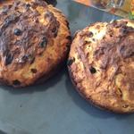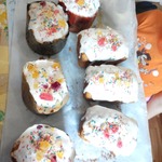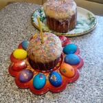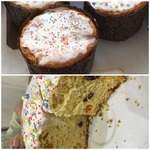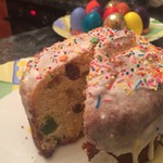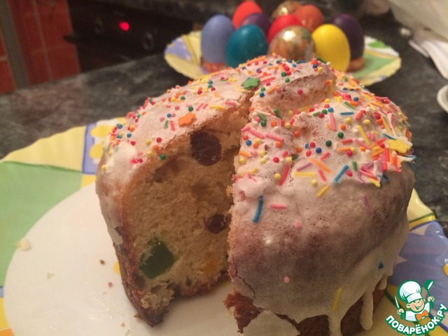 Половину нормы изюма я заменила на цукаты, но должна сказать, что этого количества мне показалось маловато для куличей. Вы можете видеть на разрезе, что их почти и не видно. Думаю, что смело можно увеличить их количество вдвое. -