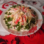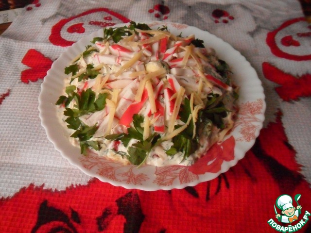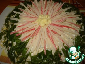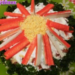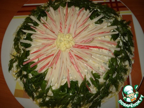 Оставшиеся крабовые палочки режем тонкой соломкой и формируемым цветок. Из небольшого кусочка желтка делаем серединку. Украшаем укропом и петрушкой.