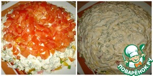 Помидор режем кубиками кладем на яйца. Сыр трем на терке и смазываем заправкой.