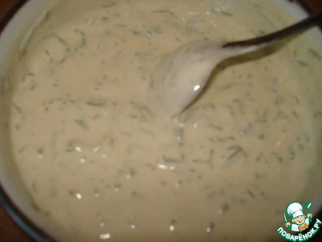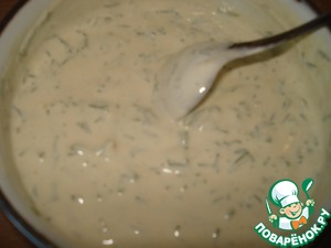 Для начала приготовим заправку. Смешиваем сметану, горчицу, мелко нарубленный укроп (небольшой пучок) и соль (по вкусу).