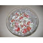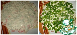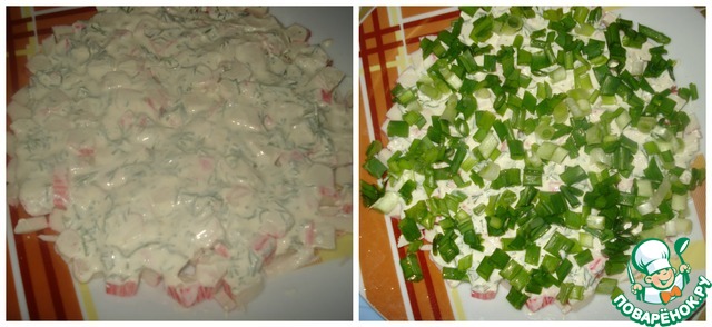 Крабовые палочки режем кубиками, 3 палочки оставляем для украшения. Смазываем заправкой. Посыпаем, мелко нарезанным, зеленым луком.