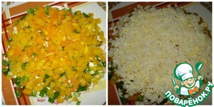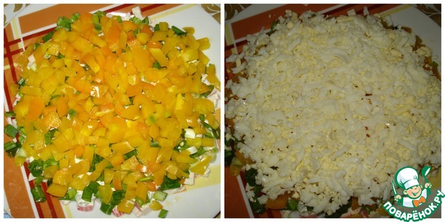 Перец нарезаем также, кубиками, кладем на лук. Яйца трем на терке и смазываем заправкой.