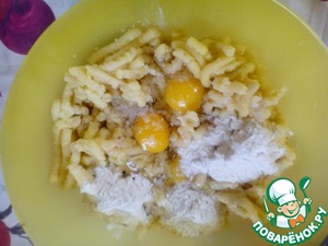 Добавляем в картофель яйца, муку, соль и вымешиваем мягкое тесто