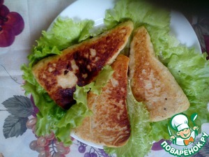 Раскатываем тесто, нарезаем на 8 треугольников, на середину аккуратно помещаем печеночную начинку, накрываем другим, края защипываем. Я кладу кусочек масла сливочного в начинку, но если подавать со сметаной можно этого не делать.