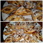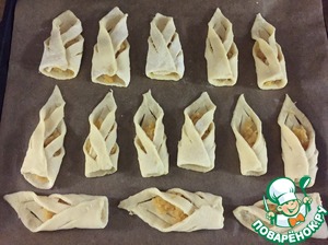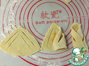 Достаем тесто, делим на 4 части. Одну часть раскатываем в круг на посыпанном слегка мукой столе, толщиной 3 мм. Круг делим на 5 сегментов. Делаем на сегменте 4 надреза, на середину кладем 1 ч. л. начинки, закутываем тесто и слегка прищипываем, чтоб не распалось. С остальным тестом повторяем процедуру. Печеньки выкладывала на противень застеленный пекарской бумагой, поэтому дополнительно маслом не смазывала. С порции получилось 22 башмачка