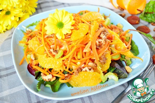 Настроение очень рыжее и солнечное) Хочу им поделиться с вами. В салате очень много витамином и хорошего настроения. Продукты хорошо гармонируют вместе. Сочно, свежо, вкусно и очень полезно!