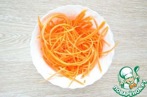Моем и чистим морковь. Натираем на крупной тёрке или режем соломкой. Обжариваем на небольшом количестве растительного масла Олейна на сильном огне в течении 2х минут, постоянно помешивая.