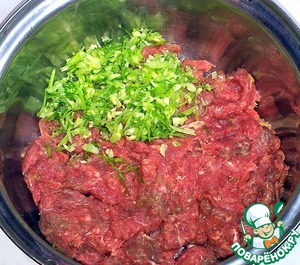 Мясо говядины пропустила через мясорубку. Сельдерей, укроп, чеснок измельчила в измельчителе и перемешала.