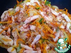 • Готовую фунчозу добавить к курице с овощами, все хорошо перемешать, накрыть крышкой и дать потомиться 2-3 минуты.