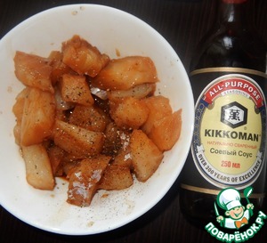 В емкости смешиваем соевый соус Киккоман с лимонным соком и молотым перцем, добавляем туда наше филе и оставляем мариноваться на 10 минут, периодически перемешивая. -