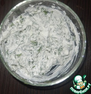 Творожный сыр смешиваем с мелко нарезанным укропом. (Я использую домашний сыр, он не соленый совсем, готовлю его из простокваши 8,9% жирности, замораживаю и откидываю на ткань, после оттаивания и стекания сыворотки получается хороший нежный и вкусный сыр.) Включаем духовку на разогрев на 180 градусов.