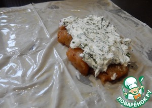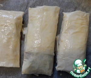 Сливочное масло растапливаем, берем лист теста фило, смазываем его сливочным маслом, выкладываем рыбу, сверху смесь сыра с укропом.