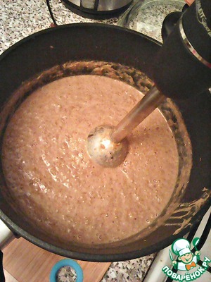 Готовую чечевицу немного остужаем, взбиваем блендером, добавляем грибную кашицу и снова взбиваем.