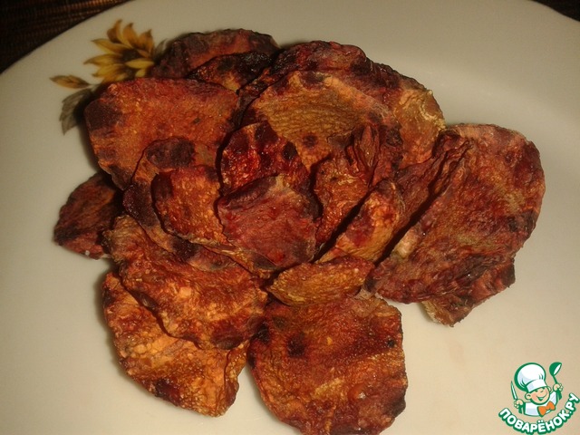 Подготовьте тарелку и выложите на нее пергаментную бумагу. На бумагу выложите небольшое количество ломтиков из свеклы и сбрызните подсолнечным маслом Олейна. Помещаем в СВЧ на полную мощность на 1 или 2 минуты. Микроволновки у всех разные, поэтому следите за процессом. А еще это зависит от толщины среза ломтиков.