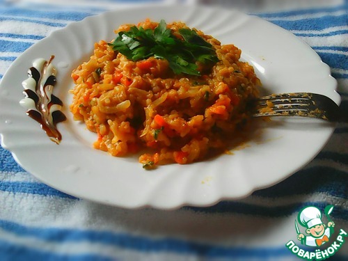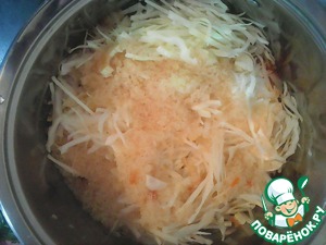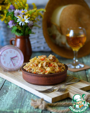 Поджарка у нас готова, перекладываем в кастрюлю, сверху засыпаем капустой и рисом. Наливаем горячей воды, перемешиваем, закрываем плотно крышку и тушим до готовности.