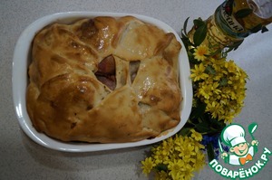 Уложенное мясо накрывается краями теста, при этом оставляется небольшое отверстие. Затем запекается в духовке
