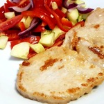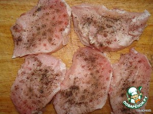 Я быстро розморозила кусочек свининки, у меня была филейка, и порезала такими толстенькими кусочками и присыпала перцем черным.