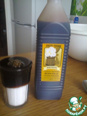 - Солод (Я использую экстракт для приготовления домашнего пива , в его состав входит солод ячменный и вода. Можно использовать тёмный сироп если не найдёте солода в продаже .Тогда просто кладите 1 стакан тёмного сиропа и не используйте сахар. Есть специальные добавки для приготовления домашнего хлеба,можно использовать такую добавку вместо солода.) — 0,5 стак.