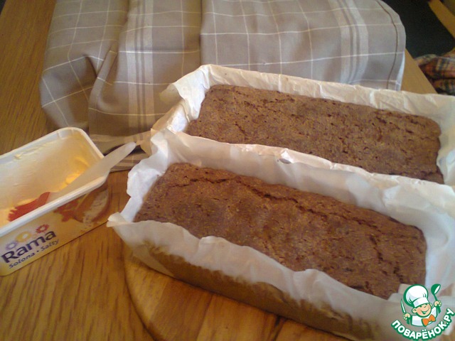 Наш хлебушек пекся 55 минут, в предварительно разогретой духовке при температуре 180 гр. Ориентируйтесь по своей плите, чтобы хлеб не пригорел сверху. Каждая хозяйка знает свою духовку, если есть необходимость поставьте миску с водой на дно духовки. Я пробовала и так и так, без воды лучше. Температура 180 гр.+ конвекция на средней полке за 55 минут всё прекрасно пропечётся. Готовый хлеб вынуть из форм, освободить от бумаги и смазать маслом. Завернуть готовый и смазанный хлеб в полотенце ( я использую льняные полотенца только для хлеба).