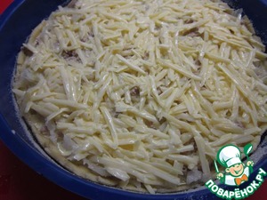 Залить пирог заливкой, при этом жидкая часть заливки пропитает начинку, а сыр останется на поверхности, его нужно будет распределить по поверхности пирога.