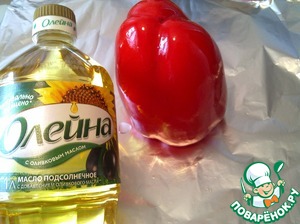 Перец смазать подсолнечным маслом "Олейна", запечь в разогретой до 220*С духовке 15 минут, переложить в миску, накрыть пленкой и оставить на 10 минут.