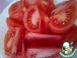 На помидорах сделать крестообразные надрезы и опустить в кипящую воду на 2 мин. Снять кожицу и разрезать на дольки.
