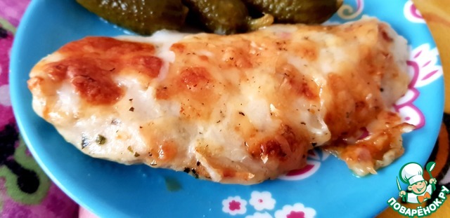 Затем посыпаем нашу курицу оставшимся сыром и отправляем в нагретую духовку. Выпекаем до превращения сыра в золотую корочку. Чем выше температура духовки, тем быстрее приготовится блюдо.