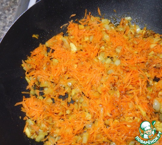 Морковь натираем на мелкой терке и отправляем на сковороду, даем потушиться 3-5 минут.