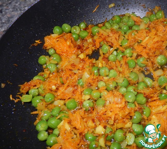 Затем добавляем горох, закрываем крышкой, и тушим еще 5 минут.
