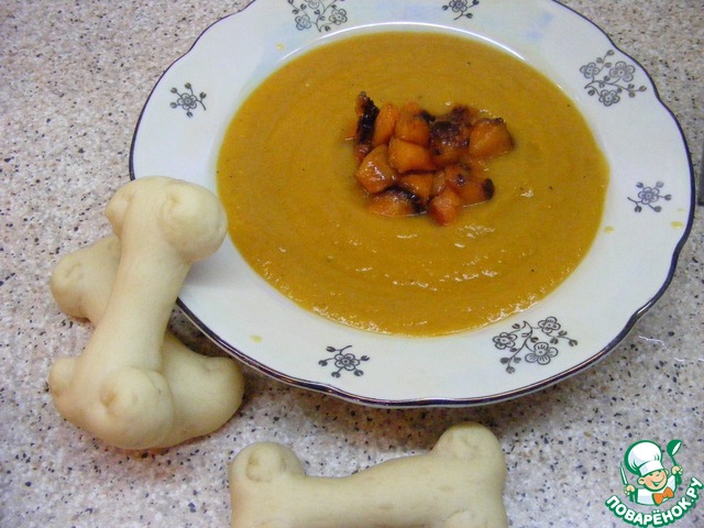 Вкуснейший суп!!! Необыкновенное сочетание мандарина и тыквы. Меня этот суп покорил и теперь надолго поселился в моей семье. А еще представляю вам хлебные палочки в виде косточек. Эти вкусняшки особенно любят дети, ну, и взрослые, конечно.