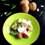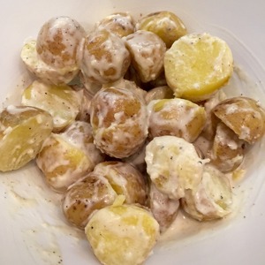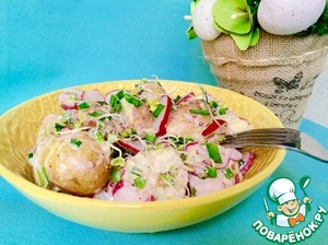 Картофель, заранее отваренный, горячий и порезанный пополам заливаем заправкой, очень аккуратно перемешиваем и оставляем остывать.