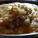 Выкладываем всю перловую крупу с фаршем и овощами в глиняный горшочек (объем 1 л). Готовим заливку из яйца, душистого перца, соевого соуса Kikkoman и молока, воды. Так как у меня молоко домашнее и жирное, то я его разбавляю немного водой. Аккуратно заливаем кашу. Если не хватает солености соевого соуса, то можно по вкусу посолить.