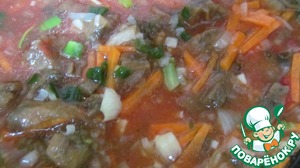 4. Томатную пасту развести 0,5 стак. воды и добавить к овощам.