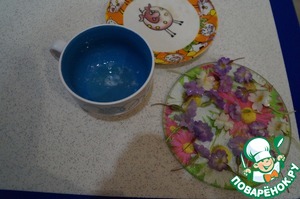 Предварительно засахариваем цветы, они должны высохнуть (цветы кисточкой намазываем слегка взбитым белком, а потом обсыпаем сахарной пудрой и оставляем высохнуть). Я использовала цветы примулы или первоцвета.