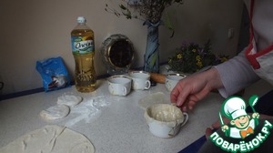 - Тесто пресное (вода горячая 100 мл , мука 200 гр соль 0,5 ч.л.,масло раст. 1 ст. л.) — 300 г