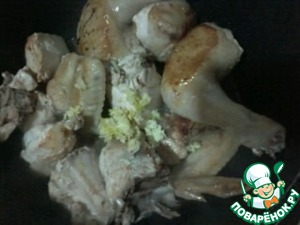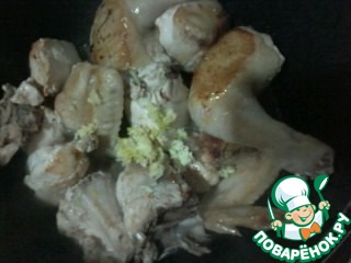 Теперь добавляем чеснок через чеснокодавку и еще немного жарим под крышкой, но огонь уменьшаем.