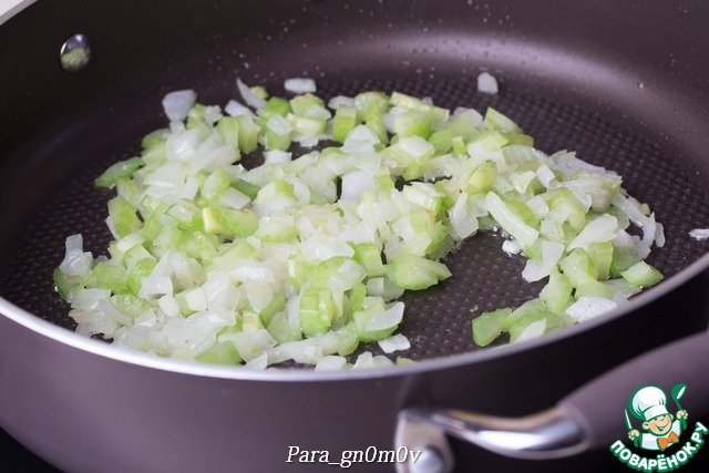 2. Сельдерей порезать мелким кубиком. Добавить к луку и обжаривать еще пару минут.