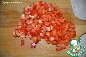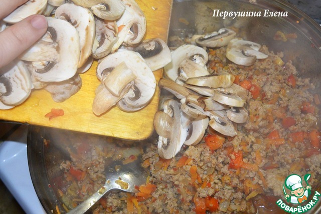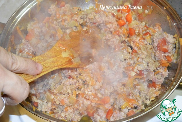 Добавить перец и фарш. Фарш размять хорошо вилкой. (Можно использовать мясо, нарезанное маленькими кубиками, будет тоже неплохо).