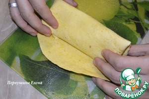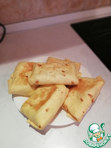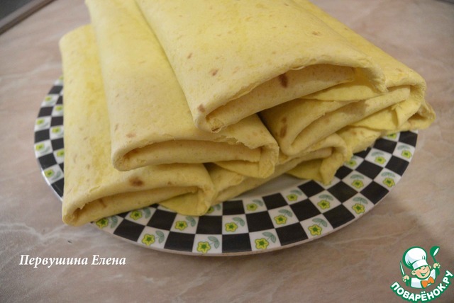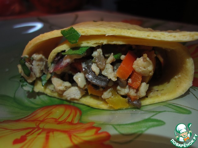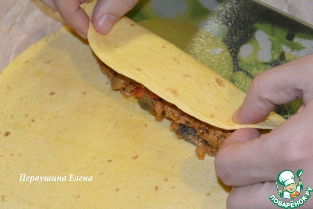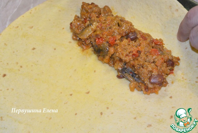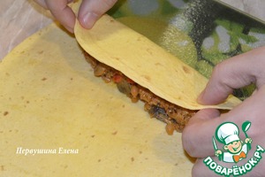 Взять одну лепешку (тортилью) и выложить часть массы, как показано на фото. Начинку не жалейте, но и не усердствуйте, иначе вытечет.