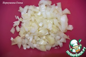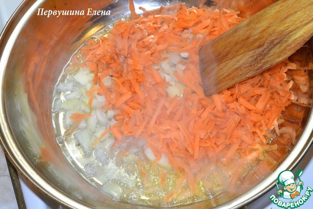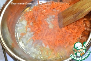 Разогреть растительное масло на сковороде и обжарить лук с морковкой.