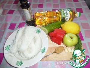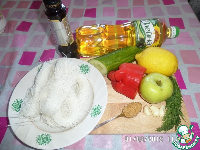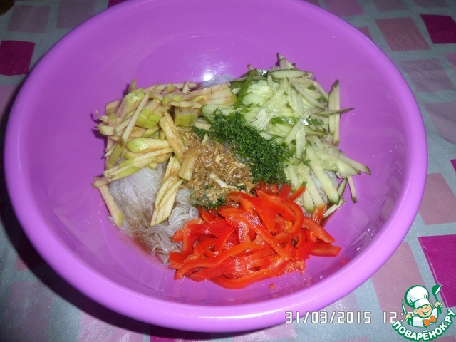 В рабочей чашке соединяем фунчозу, нарезанные овощи и яблоко, укроп. Заливаем подготовленным соусом.