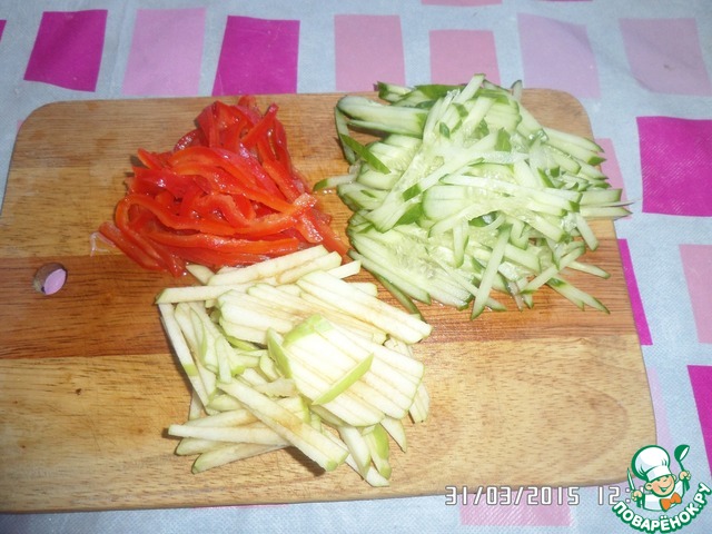 Яблоко, огурец и перец нарезаем соломкой. Из лимона выжать сок.