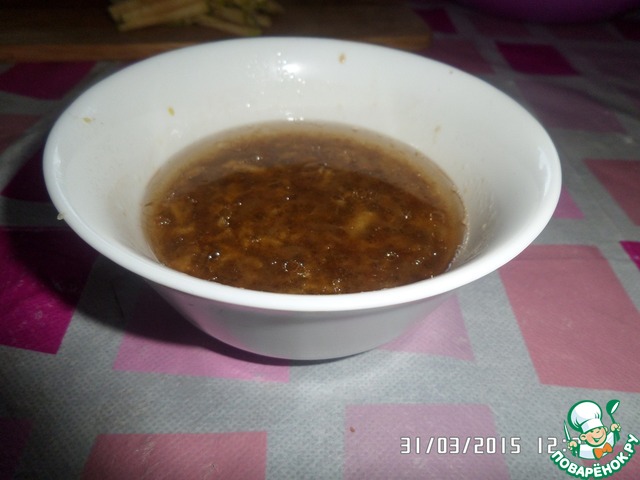 В отдельной чашке смешиваем 2 ст. л. лимонного сока, соевый соус, растительное масло, сахар и измельченный чеснок.