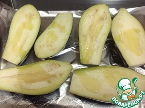 Баклажаны разрезать на половинки, посолить, сбрызнуть оливковым маслом и выложить на противень, завернув в фольгу.