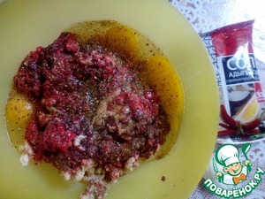 Добавляем яйца, специи, соль и муку. Вымешиваем фарш /получается как на оладьи/, немножко жидковатый.