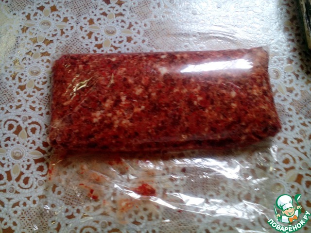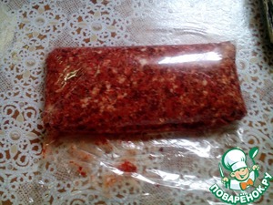 Выкладываем получившуюся массу в пакет для запекания, плотно заворачиваем в рулет, я для надёжности заворачиваю в два пакета